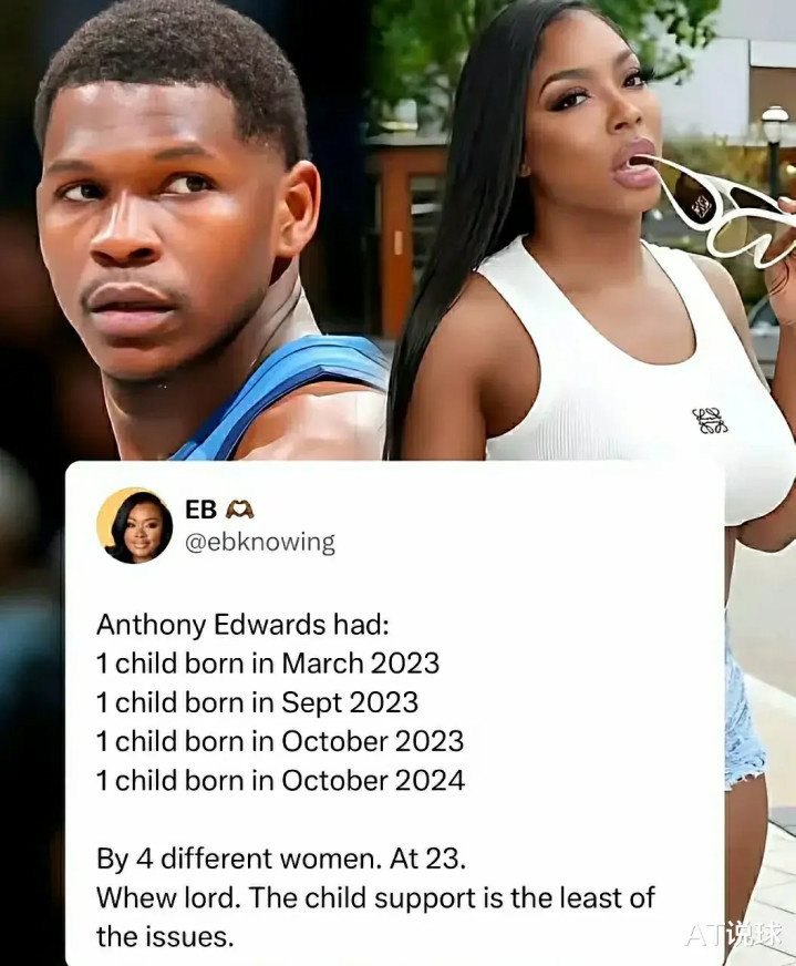 场上的爱德华兹实力非凡,早早的就体验到了季后赛的滋味,全明星和最佳阵容这种象征实力的阵容也已经进过,虽然还没有打进过总决赛,好在爱德华兹目前还非常年轻,拥有着非常美好的前景和未来。但爱德华兹目前却有一个幸福的烦恼,那就是他的孩子实在是有些太多了,有球迷列出了爱德华兹在19个月内一共生了4个孩子,平均每5个月就要生一个娃。